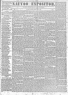 - ↑ https://books.google.com/books?id=pGi-iiz6juYC&pg=PA432&lpg=PA432 History of the Church vol. 6 (1912), p. 432: "The Council passed an ordinance declaring the Nauvoo Expositor a nuisance, and also issued an order to me to abate the said nuisance. I immediately ordered the Marshall to destroy it without delay."