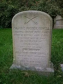 Josephine Shaw married Charles Russell Lowell, a businessman, in 1863. She followed him to Virginia when he was called into service during the Civil War. Lowell helped wounded men on the battlefield. She also prepared and send parcels through United States Sanitary Commission to soldiers on the front.[2] Charles died in battle, less than a year after they were married and only one month before their daughter, Carlotta, was born.