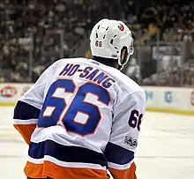 Ho-Sang chose to wear sweater #66 for the Islanders as an homage to Mario Lemieux, who, in response to the controversy generated by the choice, said he had no problem with Ho-Sang wearing the number. Ho-Sang defended his choice, arguing that he did not merely pay homage to Lemieux's on-ice prowess but also his contributions to the community of Pittsburgh. "He fought and continues to fight for other people," Ho-Sang said. "He thinks outside himself. For me, that's a man worth looking up to. That's why I wear the number. That's the type of guy who's behind that number, and that's what's so inspiring for me...."[46] He is the second player, after Calgary Flames defenceman T. J. Brodie, to wear the number after Lemieux in a regular season game.[46][47] At the start of the 2018–19 NHL pre-season Ho-Sang was asked by general manager Lou Lamoriello to change his Islanders jersey number,[48] as Lamoriello has long stood by a policy which generally forbids players from wearing any number higher than 35.[49] Ho-Sang chose to wear #26 instead.[48]