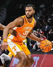 James missed much of the preseason with a hip injury. He scored seven points in Tennessee's first two games. In a 75–62 win over Washington, James finished with nine points, five assists and four rebounds.[8] On January 4, 2020, James scored a career-high 15 points on 5-of-11 shooting in a 78–64 loss to LSU.[9] He was ruled out with a hip injury on January 30.[10] As a freshman, James averaged 7.4 points, 5.5 rebounds, and 2.9 assists per game.[11] On January 30, 2021, he suffered a wrist injury against Kansas, forcing him to miss two games. As a sophomore, James averaged 8.0 points and a team-leading 6.5 rebounds per game. He underwent wrist surgery in the offseason.[12]