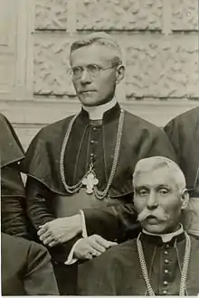 Born in a Slovene-speaking family in Solkan, Austria-Hungary[1][2] (Solkan is now part of Nova Gorica, Slovenia), he was ordained in 1906.[1] In 1923, he became Bishop of Krk in Croatia,[2][3] then part of the Kingdom of Serbs, Croats and Slovenes. He served as bishop on the island of Krk for almost forty year, until 1961. During this long period, he publicly defended the freedom of the Roman Catholic Church against different authorities. He opposed the unificatory tendencies of the dictatorship of King Alexander I of Yugoslavia; in 1932, he published the booklet Crkvi slobodu! (Freedom to the Church!), in which he denounced the educational and cultural policies of Alexander's royal dictatorship. Between 1941 and 1943, he voiced his opposition to the chauvinist anti-Croatian policies of the Italian Fascist forces, and organized humanitarian help for the prisoners in the Italian Rab concentration camp, which was established on the territory under his ecclesiastical jurisdiction. He continued to publicly defend the personal and human rights of his flock during the Nazi German occupation regime (1943–1945). In 1943 he refused to join the Partisans of the National Liberation Movement in Croatia or even to provide chaplains for Roman Catholic Partisans. After 1945, he was critical of the Yugoslav Communist regime. After the Second World War, he was accused by Yugoslavia of collaborating with the Italian and German regimes.[4]