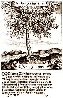 As an emblem Randow was given a half withered apple tree with branches partly covered by moss. In the membership register Randow has the number 22 meaning, that he was one of the earlier members. At its peak in 1650 the society hat 527 members.