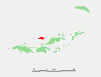 Jost Van Dyke (/ˈjoʊst væn ˈdaɪk/;[2] sometimes colloquially referred to as JVD or Jost) is the smallest of the four main islands of the British Virgin Islands, measuring roughly 8 square kilometres (3 square miles). It rests in the northern portion of the archipelago of the Virgin Islands, located in the Atlantic Ocean and Caribbean Sea. Jost Van Dyke lies about 8 km (5 mi) to the northwest of Tortola and 8 km (5 mi) to the north of Saint John. Little Jost Van Dyke lies off its eastern end.