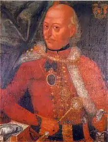 Jovan Popović Tekelija (Serbian Cyrillic: Јован Поповић Текелија; c. 1660 – c. 1721–1722) was a Serb army officer serving in the Habsburg army. As commander of the Serbian Militia, Tekelija participated in many battles distinguishing himself in particular during the Battle of Zenta in 1697 where the Ottoman Empire suffered a stunning defeat. For his merit, he was appointed Captain of the Serbian militia in Arad and ennobled by Emperor Joseph I.