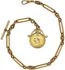 By September, The Graphic was reporting that the new coins were scarce in circulation, and there was talk that many of them had been sent to the colonies. The withdrawn sixpence carried a premium, as did the five-pound piece, and some crowns had been gilded to pass for the five-pound coin.[46] The Sheffield Independent's London correspondent reported on 17 September that the withdrawn sixpences were passing for half a crown each, and that in addition to the quantities of coin sent to the colonies, large amounts had been absorbed by jewellers, who placed them in ornaments, and by visitors to London seeking souvenirs of the Jubilee, especially Americans.[47]