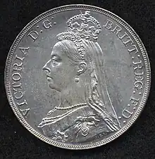 The Standard wrote on 29 June, "The portrait of the Queen is not a bad likeness, though certainly not a pleasing or a dignified one. As to the Crown and the head-dress they are quite unnecessary and a distinct disfigurement."[37] The Freeman's Journal stated, "Those who have seen the new coins are not taken with them. The bust of the Queen with the crown toppling off the back of her head is not conducive to artistic merit [...] the smaller silver coins bear no record of their value, which is another drawback. Altogether the Jubilee coinage is not likely to create much enthusiasm."[35] The Western Mail of Cardiff stated that "The head of the Queen on all the coins is also generally objected to, her Majesty having none of the dignified appearance she is accustomed to present on State occasions, and the miniature crown being almost pitiable in its paltriness."[34] The Birmingham Daily Post wrote on 24 June: