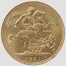 Benedetto Pistrucci[67] (1817, major modification in 1821)[71] | 1887–1892 (London Mint) 1887–1893 (Melbourne Mint) 1887–1893 (Sydney Mint)[61] Reverse most recently used in 2024.[67] |