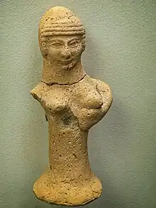 Scholarly consensus has categorized the figurines as the Canaanite great goddess Asherah.[1] Dissenting from this view, Erin Darby suggests other possible identifications.[2] They show her with some facial detail, protruding breasts, and completely plain cylindrical bodies below. Surely popular, they were often handmade and sometimes crude, but that led to a diversity of style. It also allowed them currency over a longer period of time, unlike the more sophisticated but then-late Revadim Asherah whose examples were mass-produced in the productive milieu leading up to the Bronze collapse.