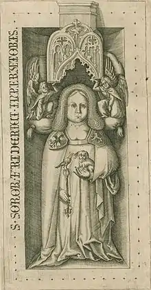 The Landgravine is depicted holding a lap dog in her left arm, while her right hand holds a scepter. A wide cantilevered canopy, held up by two angels, is extended over her head. The angels appear to sit on a pillow behind her head. The inscription reads S. SOROR FRIDERICI INPERATORIS ("the sister of Emperor Frederick").