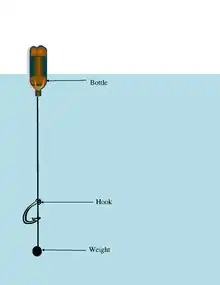 Jug fishing is an unlimited class tackle method of fishing that uses lines suspended from floating jugs to catch fish in lakes or rivers. Often, many jugs are used when jug fishing. In many states, a fisherman could use up to twenty, and jug sets of around twenty are common in practice.[1][2] Jug fishing is most common in southern states where many different kinds of people jug fish. Jugs are often put out at sunset and picked up at sunrise by the whole family.[3] Jug fishing consists of a simple setup where lines are tied onto jugs and weights can be added to the line to keep the jug's location fixed. Jug fishing is also subjected to numerous state and local water regulations that could include: the number of jugs, dates and times when jug fishing is allowed, and if jug fishing is even allowed. Many fish can be caught on jugs, but the main target of jug fishing is often catfish.