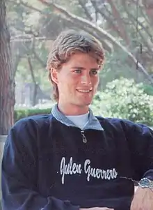 Guerrero made his senior debut on 6 September 1992 aged 18, under Jupp Heynckes.[8] He quickly made an impact and, although a midfielder, totalled 28 La Liga goals in his first two seasons (65 in six). He was awarded the New Spanish Player of the Year by El País in 1993, and won the Spanish Footballer of the Year by both Don Balón and El País the following year.[9] In 1993–94 he scored a hat-trick against Albacete Balompié (4–1, home),[10] adding four against Sporting de Gijón (7–0 also at the San Mamés Stadium);[11] his arrival at the first team was met with unprecedented furor amongst the younger population due to both his footballing abilities and his charisma,[12] and he became one of the first football celebrities as his pop-like figure boosted Athletic's image overseas.[13] He finished the campaign with 18 – fifth in the charts[14]– and was named the side's youngest-ever captain by Dragoslav Stepanović shortly after.[15][16]