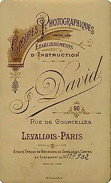 In 1873 David opened, together with Bretagne, a photo studio at the rue Gravel 54 in Levallois-Perret. The studio advertised specifically with "school photographs" (photographies des écoles), whereby schools included secondary schools, boarding schools, teacher training colleges and military academies. The association with Bretagne ended after two or three years, in 1875 or 1876, after which David set up his own studio at the rue Gravel 50. Levallois-Perret was to remain his home base for the rest of his life. After a short stay at the rue Trézel 19, in 1879 he moved to rue des Courcelles 90. In 1897 he won a bronze medal at the Brussels International Exposition.[4] From 1902 to 1910 he lived in the Rue Rivay in Levallois-Perret.[2]