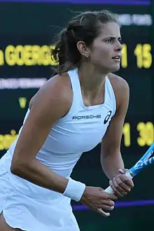 She started the grass-court season in Birmingham, where she lost in the quarterfinals to the defending champion Petra Kvitová.[61] In Eastbourne, Görges received bye in the first round and in the second round she lost to Aryna Sabalenka. At Wimbledon, Görges reached her first Grand Slam semifinal, defeating Monica Puig, Vera Lapko, Barbora Strýcová, Donna Vekić and Kiki Bertens en route.[62] She lost in the semifinal to Serena Williams.[63]