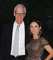 While at Northwestern, Louis-Dreyfus met future husband and Saturday Night Live comedian Brad Hall.[7] They married in 1987 and have two sons together.[86] Their older son, Henry Hall, is a singer-songwriter who has performed on The Tonight Show.[87][88] Their younger son, Charlie Hall, is an actor.[89] Her first pregnancy ended in a miscarriage.[90] In 2007, Louis-Dreyfus was invited back to Northwestern to receive an honorary Doctor of Arts degree.[91]