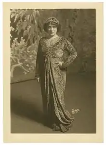 She made her Broadway debut in 1895 and went on to appear in more than seventy Broadway productions. With the money from her first Broadway success, she bought the townhouse known as River Mansion at 337 Riverside Drive.[10][11] Her first husband was Broadway actor Robert Taber. Their marriage lasted from 1894 to 1900 and produced no children.[12] According to many who knew her, Marlowe sacrificed her own self-interests many times in order to promote Taber's career. Despite this, however, professional jealousy ended their marriage in 1900. In a letter dated April 2nd, 1895 from Taber he writes "I herewith return your play. Mrs. Taber is grateful for your kindness in submitting it and notwithstanding its interest - She finds it unsuited for her present use. Very truly yours, Robert Taber". Taber was touring in England at the time of their divorce.[13] In 1901 and its subsequent 1904 revival, Marlowe starred as Mary Tudor in Paul Kester's adaptation of When Knighthood Was in Flower.[14][15] This was an enormous success, and made Marlowe financially independent. Other hits for Marlowe followed including Charlotte Oliver in the adaptation[16] by Kester and Middleton of George Washington Cable's The Cavalier, and Ingomar, both in 1903. Of her performance in the latter, The New York Sun wrote, "There is not a woman player in America or in England that is – attractively considered – fit to unlace her shoe".[17]