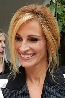 Julia Roberts is an American actress and producer who made her debut in the 1987 direct-to-video feature Firehouse.[1] She had her breakthrough the following year by starring in the coming-of-age film Mystic Pizza (1988).[2][3][4] For her supporting role in the comedy-drama Steel Magnolias (1989), she won the Golden Globe Award for Best Supporting Actress.[5][6] Roberts' next role was opposite Richard Gere in the highly successful romantic comedy Pretty Woman (1990),[7][8] for which she won the Golden Globe Award for Best Actress (Musical or Comedy).[6] In 1991, she appeared in the psychological thriller Sleeping with the Enemy, and played Tinker Bell in the Steven Spielberg-directed fantasy adventure Hook. Two years later, Roberts starred in the legal thriller The Pelican Brief, an adaptation of the John Grisham novel of the same name. During the late 1990s, she played the lead in the romantic comedies My Best Friend's Wedding (1997), Notting Hill (1999), and Runaway Bride (1999).