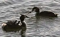 Huxley's first 'trial run' was the treatment of evolution in the Science of Life (1929–30), and in 1936 he published a long and significant paper for the British Association.[46] In 1938 came three lengthy reviews on major evolutionary topics.[47][48][49] Two of these papers were on the subject of sexual selection, an idea of Darwin's whose standing has been revived in recent times.[50][51] Huxley thought that sexual selection was "…merely an aspect of natural selection which… is concerned with characters which subserve mating, and are usually sex-limited". This rather grudging acceptance of sexual selection was influenced by his studies on the courtship of the great crested grebe (and other birds that pair for life): the courtship takes place mostly after mate selection, not before. Huxley tackled the subject of evolution at full length, in what became the defining work of his life. His role was that of a synthesiser, and it helped that he had met many of the other participants. His book Evolution: The Modern Synthesis was written whilst he was secretary to the Zoological Society, and made use of his collection of reprints covering the first part of the century. It was published in 1942. Reviews of the book in learned journals were little short of ecstatic; the American Naturalist called it "The outstanding evolutionary treatise of the decade, perhaps of the century. The approach is thoroughly scientific; the command of basic information amazing".[52][53]