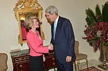 In April 2015, Bishop paid an official visit to Iran, following the conclusion of a visit to India. She was the first Australian government minister to visit the country since 2003, having been personally invited by Iran's foreign minister, Mohammad Javad Zarif. They discussed the proposed nuclear deal and issues relating to Iranian asylum seekers in Australia.[56] Bishop wore a headscarf or a hat for the duration of her visit, and did not shake hands with male dignitaries in order to avoid offending local sensibilities. She received some criticism for doing so, with Andrew Bolt rhetorically asking whether she should have "subjugated herself" to Islamic law. Head coverings are not mandatory for foreign women visiting Iran. In response, she said: "As a matter of fact I wear scarves and hats and headgear quite often as part of my everyday wear".[57][58]