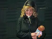 In 1984, she released her first EP, a five-song album called Goddess in Progress.[10] The album, parodies of popular '80s music combined with her valley girl personality, was quickly discovered by the Dr. Demento Show. The songs "'Cause I'm a Blonde" and "The Homecoming Queen's Got a Gun" were given radio airplay across the world.[11] The latter was a spoof on stereotypical 1950s' teen tragedy songs, with cheerleaders' heads and pompoms being blown to pieces.