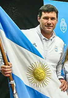 Sailor Julio Alsogaray carrying the Argentine national flag at the V South American Beach Games, in Santa Marta, Colombia, in July 2023