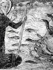| Attributes | old priest with his staff, sailing on his cloak to Isola Giulio over a lake which is full of serpents |