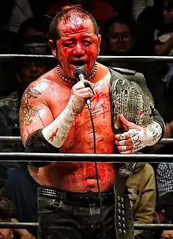 Since then Kasai has wrestled mainly for BJW and occasionally for other promotions such as Pro Wrestling Zero-One, K-Dojo and Apache Pro-Wrestling Army. Kasai's body is covered in scars, from all the hardcore wrestling he has done. This includes a Fans Bring the Weapons Match from the CZW show "Un F'n Believable", in which he took a bump onto a light tube board which ripped open his left elbow, exposing bone.[7] In 2006 he won the first-ever IWA East Coast Masters of Pain after defeating Toby Klein, Mad Man Pondo and J. C. Bailey.[8]