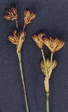 This is a perennial herb forming clumps of erect stems up to about 25 centimeters tall from a thick rhizome. The inflorescence is made up of several clusters of brown or green flowers. The flat leaves are blue-green in color. There are 2 to 6 clusters on the plant and 3 to 7 flowers in a cluster. The flowers have six brown tepals. The plump capsules are either equal to or longer than the tepals. 2n equals either 36 or 38.[4] The bloom time is from June to September.[3]