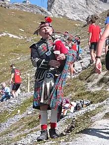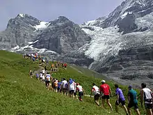 The first 10 km of the course are flat. The race begins in central Interlaken and circles around the town centre before moving east to Bönigen, where runners briefly run along the shore of Lake Brienz. The race proceeds southwards to Wilderswil at the 10 km mark. From there the course heads upward through Zweilütschinen (at 15 km) to Lauterbrunnen (at 20 km). The course loops for 5 km south of the town before returning to Lauterbrunnen and then heading eastward up the alpside. It is at this point that the race is steepest, zigzagging up the hillside and climbing 450 m in the 5 km to Wengen. The course heads southeast and relentlessly upward over the Wengernalp, turning east and then northeast beneath the Eiger toward the finish. It finishes at Eigerletscher at an altitude of 2,320 m.[3] Shortly before leaving the moraine and turning towards the final ascent, the runners are traditionally greeted by a bagpipe player.