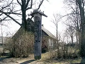 After Lithuania regained independence in 1918, Bielinis gained recognition for his book smuggling activities. The first article about him was published by Vaclovas Biržiška in Mūsų senovė.[82] His wife was awarded the Independence Medal in 1928. In 1931, Alfredas Šlikas published a booklet with Bielinis' biography.[83] In 1932, Lithuanian youth organizations (Scouts, Pavasaris, Riflemen) decorated the grave of Bielinis and built a pyramid of field stones with an ornate metal cross. The primary school in Suostas was named after Bielinis.[84] Streets in several cities and towns, including in Vilnius, Kaunas, Panevėžys, Mažeikiai, are named after Bielinis.[85] The wooden cross under which Bielinis fell and later died was discovered in 1990 by Bielinis' grandson[86] and is exhibited in the chapel of the Bistrampolis Manor. Carved in 1881, it is one of the oldest surviving wooden crosses in Lithuania.[87]