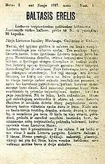 In June 1895, Vienybė lietuvninkų and Žemaičių ir Lietuvos apžvalga published an announcement that a new newspaper Liuosybė (Independence) will be published in various languages of the subjugated people of the Russian Empire, including Lithuanian, Latvian, Estonian, Polish, Belarusian, Finnish, even Caucasian and Siberian languages. It was signed by Juozapas Baltasis, a pen name of Bielinis.[47] The Garšviai Book Smuggling Society started organizing its own printing press in late 1894 by purchasing equipment and supplies through Martynas Jankus.[48] After the arrests, Bielinis took over the press which was not discovered by the police. In fall 1896, Bielinis took the press to Steponas Povilionis in Gripkeliai and they started working on a newspaper Baltasis erelis (The White Eagle) – the title referenced the coat of arms of Poland which Bielinis believed Poles took from the Lithuanians. The 8-page publication appeared with 1897 date.[49] The first seven pages summarized the history of Lithuania that Bielinis was working on at the same time. The last page discussed the coronation of Nicholas II of Russia and how a Lithuanian noble spent 10,000 rubles on the festivities and expressed belief that if the nobility could spend so frivolously on a foreign Tsar, they would give money to a new international newspaper (echoing the announcement published in June 1895).[50] The newspaper was signed Juozapas Baltasis Erelis Lietuvos Karalius. Spausdinta Lietuvos griuvėsiuose. (Juozapas White Eagle King of Lithuania. Published in the ruins of Lithuania). But it was an unrealistic goal and only one issue of Baltasis erelis appeared.[51] The fate of the printing press is unknown. Vaclovas Biržiška believed that Bielinis transferred it to the Social Democratic Party of Lithuania which wanted to publish a newspaper in Vilnius, but that press was confiscated by the police in 1899.[52]
