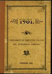 In 1900, Bielinis published 80-page 1900. Knįga paaukauta atminimui sukaktuvių devynioliktojo amžiaus (1900. Book Dedicated to the End of the 19th Century) in which he provided a short history of Lithuania and then described injustices suffered by the Lithuanian peasants.[57] In particular, he highlighted the case of Ignacy Karp, a noble from Upytė, who freed his serfs in his last will (republished in the booklet) but his heirs did not follow the last will and continued to exploit the serfs. According to Bielinis, the Karp family destroyed 300 farms and took some 15,000 dessiatins of land. He ended the work with a personal story about injustices he suffered as a farmer in Purviškiai.[57] The following year, Bielinis followed up with the 16-page booklet 1901. Testamentas Lietuvos tautai del dvidešimto amžiaus (1901. Testament to the Lithuanian Nation for the 20th Century) in which he provided his ideas and suggestions for improving conditions in Lithuania. His ideas were naive and unrealistic and remained unnoticed by other activists. For example, elimination of the nobility social class, Lithuania's involvement in foreign affairs of Austria-Hungary, France, and Germany, public removal and whipping of the statue of Mikhail Muravyov-Vilensky, etc.[58] In 1902, Bilienis published another 72-page booklet Lietuvos adminitsracija (Administration of Lithuania) in which Bielinis retold fiction texts by Eliza Orzeszkowa (novel Niziny), Stasys Matulaitis, Kazimieras Pakalniškis, articles published in Tėvynės sargas as well as personal experiences of injustice and listed other instances of discrimination by the Karp and von der Ropp families. Matulaitis criticized the work in Varpas for its disorganized material.[59]