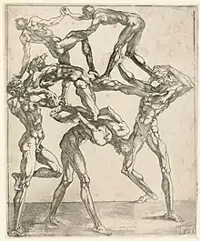 Juste de Juste left a set of twelve small single etched figures (about 195 x 83 mm each; Zerner 6-17) and another set of five larger prints each showing five or six naked male figures forming improbable human pyramids (these about 267 x 205 mm; Zerner 1-5).[3] All the figures are elongated and muscular and many of their faces have anguished grimaces; over much of their bodies the musculature is so exposed they seem flayed, but they have hair and faces.[4] They are usually interpreted as academic exercises in drawing the male figure, perhaps related to the art student's game of marking a number of dots on a piece of paper and then constructing a figure to incorporate them - it is typical of such exercises that the figures touch the frame of the image at several points. The etching technique is personal and direct, but probably not that of a practised printmaker. Like many Fontainbleau prints, the technical finish of the etching is poor, with many unintended marks and variations in the strength of lines, but the images have an intriguing impact. In the case of both sets there is some evidence that there were other members which have not survived.[5]