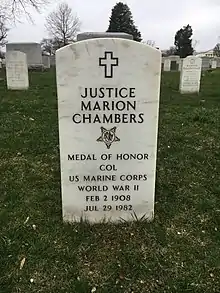 Colonel Justice Marion Chambers (February 2, 1908 – July 29, 1982) was a United States Marine Corps officer who received the Medal of Honor for actions in World War II during the Iwo Jima campaign.