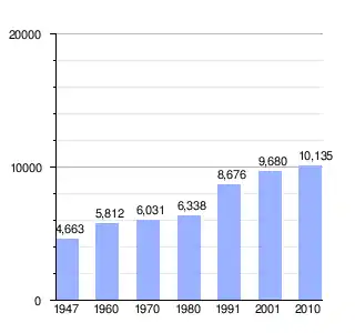 Vertical bar chart demographic of Justo Daract between 1947 and 2010