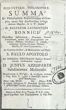 Justus Azzopardi (18th century) was a minor Maltese philosopher. His area of specialisation in philosophy was chiefly metaphysics.[1] No portrait of him is known to exist as yet.