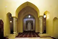 The prayer hall is entered from the courtyard via a large keel arch flanked by two smaller arches with supporting columns, an arrangement that recurs in Fatimid architecture.[2] Beyond this is a rectangular space covered by cross-vaults, followed by a roughly square area covered by a dome, flanked by two more spaces each covered by a cross-vault. The dome rests on an octagonal base with four plain squinches.[2]