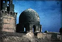 The building's construction is dated by an Arabic foundation inscription to 1085, during the Fatimid period and the reign of al-Mustansir Billah. The inscription identifies the structure as a mashhad (Arabic: مشهد, lit. 'shrine'), meaning a commemorative shrine or mausoleum.[2][3] It is not clear whom the mashhad commemorates or what its exact function was.[4][1] The most plausible theory is that the monument commemorates the victories of Badr al-Jamali, the powerful Fatimid vizier whose title, Amir al-Juyush ("Commander of the Armies"), is invoked in the foundation inscription.[5] Badr al-Jamali himself was not buried here, but rather in a tomb outside Bab al-Nasr, according to al-Maqrizi.[2] The structure's isolated setting on the Muqattam hills above Cairo is also unusual and has even led to one scholarly theory suggesting it was actually a watchtower disguised as a mosque.[2][1][4]