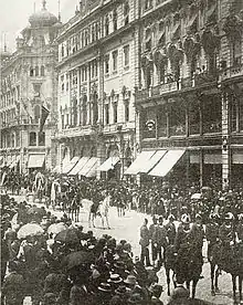 Another project was the development of the Grand Boulevard. After rejecting Ferenc Reitter's original plan for the construction of navigable channels, the city administration designated the boulevard's route from the Margaret Bridge to the Üllői Street.[23] The first phase lasted from 1872 to 1883 with minimal construction occurring because of the economic crisis of 1873. During this time only twenty-three public facilities were built along the boulevard, including the above-mentioned People's Theatre and Nyugati Railway Terminal. At the time of Kamermayer's second mayoral term, the government and the city administration accelerated the work. Between 1884 and 1890, 106 buildings were constructed and the route between Váci Avenue and Király Street was almost completely rebuilt with several municipal flats, iron factories, tanning-yards, and clothes factories. The third phase was launched in 1891, during Kamermayer's last term, and continued until the 1896 millennium celebrations. The New York Palace, the Comedy Theatre, and the Royal Hotel were built during this period.[32]