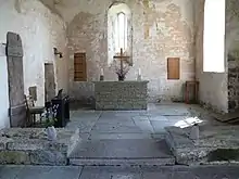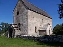 Beneath the floor of the presently visible church building, traces of wood have been found which point to the existence of an earlier, wooden church on the same spot. This first church was probably erected during the 11th century. During the 1170s a stone tower was erected, possibly attached to the wooden church or else free-standing, and serving a defensive purpose. Subsequently during the 13th century the wooden church was replaced with the stone building now visible. The church still retains essentially the same appearance as it had at the end of the century; only minor adjustments have been made since.[1] It is indicative of the way several fortified churches on Öland may have appeared during the Middle Ages.[2]