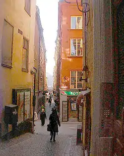 On a map dated 1733, the upper part of the street, between Stortorget and Västerlånggatan, is called Kåkbrinken, while the lower part is given several names:[1][3] Kocks gränd (referring to the burgher Ragvald Kock); Jokum bagares, Bagare gränd, Schultens gränd, and Nedre Schult gränd (referring to the baker Joachim Schult); Söte Gudmunds gränd Söte gummans gränd ("Alley of the Sweet Old Woman", Gudmund is also a proper name), Lasse Månssons gränd, Björn Perssons gränd, Mäster Eriks gränd (referring to men with those names), and Påfvel murmästares gränd ("Alley of Masonry master Paul"). Before the names of the streets of Gamla stan were fixed in 1885, the name 'Kåkbrinken' was used for various parts of its present extension.[1]