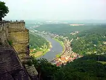 View from the fortress of the village of Königstein and the Elbe with the so-called Königsnase ("King's Nose") at the left of the picture