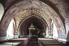 Both the nave and the chancel are richly decorated with church murals from the 1460s. The vaults in the nave contain pictures which tell the story of Genesis, while the chancel show the Last Judgment. Stylistically, the murals are related to those in Vittskövle Church.[1]