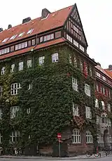 KVUC's main campus is known as V8 after its address on Vognmagergade 8 in the city centre. The building which overlooks Rosenborg Castle Garden is the former headquarters of Københavns Belysningsvæsen from 1913. It has a floor area of approximately 20,000 square metres and was designed by Gustav Bartholin Hagen in collaboration with Rolf Schroeder.[1]