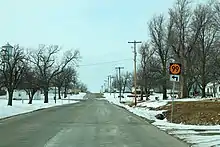 K-99 passes through four physiographic regions. The highway passes through the western edge of the Chautauqua Hills immediately north of the Oklahoma state line. K-99 continues through the Osage Cuestas. The highway passes through the Flint Hills from north of Emporia to the Kansas River at Wamego. A subset of the route's course through the Flint Hills, from Eskridge to near Wamego, is part of the Native Stone Scenic Byway, which recognizes the region's limestone, which was used in much of the region's masonry.[4] From there, K-99 passes through the Glaciated Region to the Nebraska state line.[5] K-99 has four memorial highway designations. From the Oklahoma state line to Severy, the highway is part of the Prairie Parkway. The route is part of Maisie Devore Highway along its concurrency with K-4 from Eskridge to near Alma. K-99 follows The Road to Oz from Interstate 70 (I-70) near Alma to the south city limit of Frankfort. Finally, the route is named the Frankfort Boys World War II Memorial Highway from the south city limit of Frankfort to U.S. Route 36 (US-36) near Beattie.[6][7] The Frankfort Boys designation, approved by the Kansas Legislature in 2012, honors the World War II casualties of the city of Frankfort; more residents per capita died in the war from Frankfort than from any other community in the United States.[8]