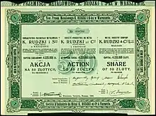 By 1873 Konstanty Rudzki was able to acquire all outstanding shares in the company for a price of 51,600 roubles.[4][10] However, he over-invested and the company could not repay its debt of 12,000 roubles so in 1878 Konstanty Rudzki was forced to find new partners.[4][11][10] Eventually he retained 52 percent of shares, with the remainder in the hands of Alfred Czarnomski, Władysław Mazurowski and Józef Korycki.[4][12] Since then the company started to expand rapidly. In 1879 there were 221 workers employed in Rudzki's Warsaw works, by the end of the 19th century the number rose to 890, while value of production rose from 180,000 roubles to 2,132,000 roubles.[4] In 1892 the company was also formally transformed into a joint stock company.[4][13]