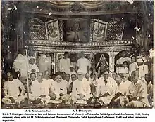 Sri. K. T. Bhashyam (Minister of Law and Labour, Government of Mysore) at Thiruvallur Taluk Agricultural Conference, 1948 closing ceremony along with Sri. M. O. Krishnamachari (President, Thiruvallur Taluk Agricultural Conference, 1948) and other conference dignitaries.