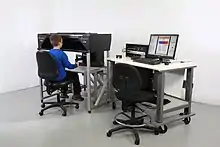 KINARM robots assess the user's ability to interact with a two-dimensional virtual reality environment using their upper limbs. The KINARM Exoskeleton uses a motorized exoskeleton to measure and manipulate the function of the upper limbs and is produced in both human and non-human primate (NHP) versions. The KINARM End-Point uses hand-held robotic rods and is used primarily for human use. Both robot labs are available with gaze-tracking technology.[6]