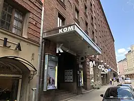 KOM-teatteri (transl.KOM-theater) is a theater founded in 1971 in Ullanlinna, Helsinki. Before its founding, it operated as an independent group for one year at the Swedish Theatre in 1970/1969.[1] It was one of the major names of the leftist political song movements of the 1970s, which influenced Finnish politics, together with Agit-prop. KOM-teatteri has released a total of 12 total albums, which during the 1970s mostly consisted of leftist or Industrial folk music.[2] It is primarily a drama theater today, with the occasional has various concerts or progams.[3][4]