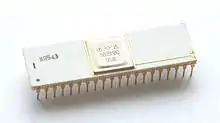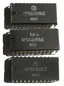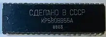 The KR580VM80A (Russian: КР580ВМ80А) is a Soviet microprocessor, a clone of the Intel 8080 CPU.[1][2] Different versions of this CPU were manufactured beginning in the late 1970s, the earliest known use being in the SM1800 computer in 1979. Initially called the K580IK80 (К580ИК80), it was produced in a 48-pin planar metal-ceramic package. Later, a version in a PDIP-40 package was produced and was named the KR580IK80A (КР580ИК80А). The pin layout of the latter completely matched that of Intel's 8080A CPU. In 1986 this CPU received a new part number to conform with the 1980 Soviet integrated circuit designation and became known as the KR580VM80A (КР580ВМ80А), the number it is most widely known by today (the KR580VV51A and KR580VV55A peripheral devices went through similar revisions). Normal clock frequency for the K580IK80A is 2 MHz, with speeds up to 2.5 MHz for the KR580VM80A. The KR580IK80A was manufactured in a 6 µm process.[3] In the later KR580VM80A the feature size was reduced to 5 µm and the die became 20% smaller.[4]