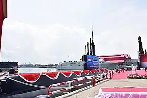 Prior to the original launching in October 2018,[8] engineers discovered that the PT PAL Dockyard in Surabaya was too shallow for the submarine to be launched. Thus the Nagapasa was floated on a barge and relocated to Semarang Dock, within the same shipyard in Surabaya, about 350m away, but later returned the submarine to its original yard, where it was launched on 11 April 2019.[9]